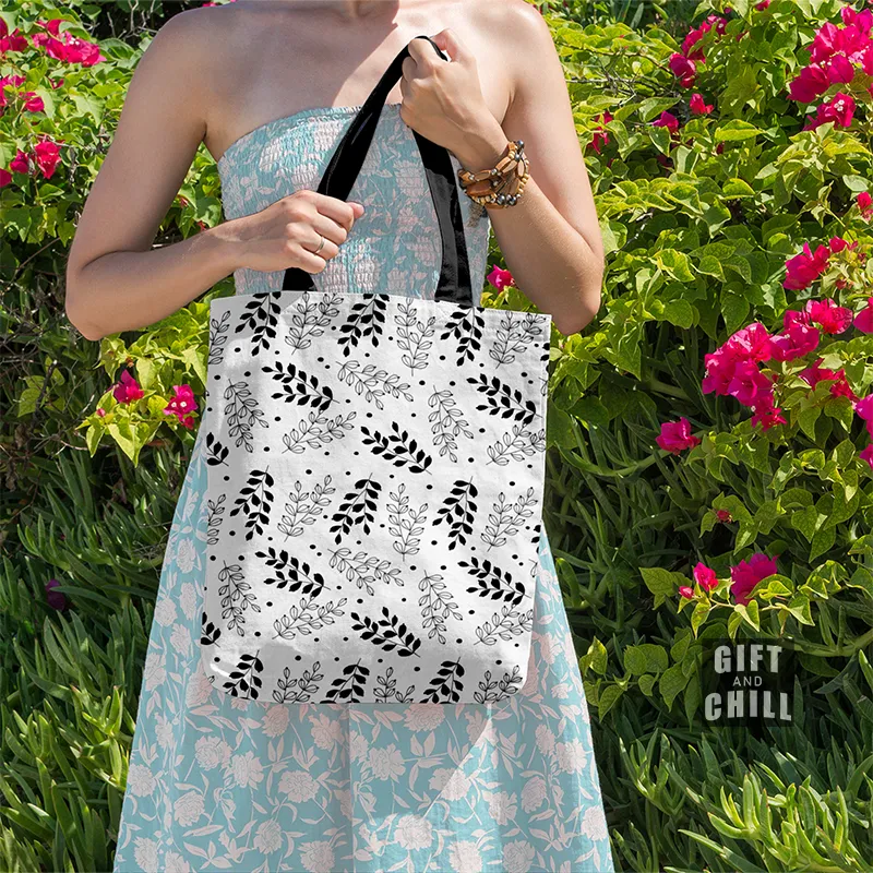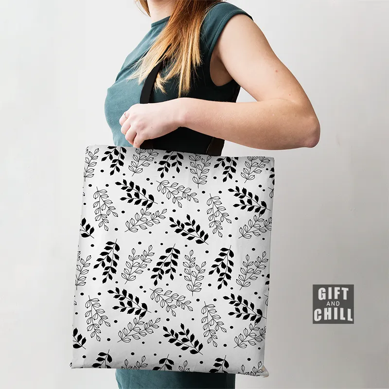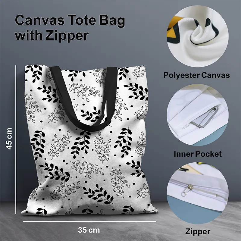 Leaf Pattern Black and White Canvas Tote Bag with Zipper 29 [FREEBIE Scrunchie]