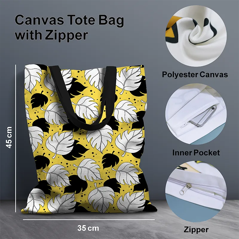 Beautiful Leaf Pattern Yellow Canvas Tote Bag with Zipper 47 [FREEBIE Scrunchie]